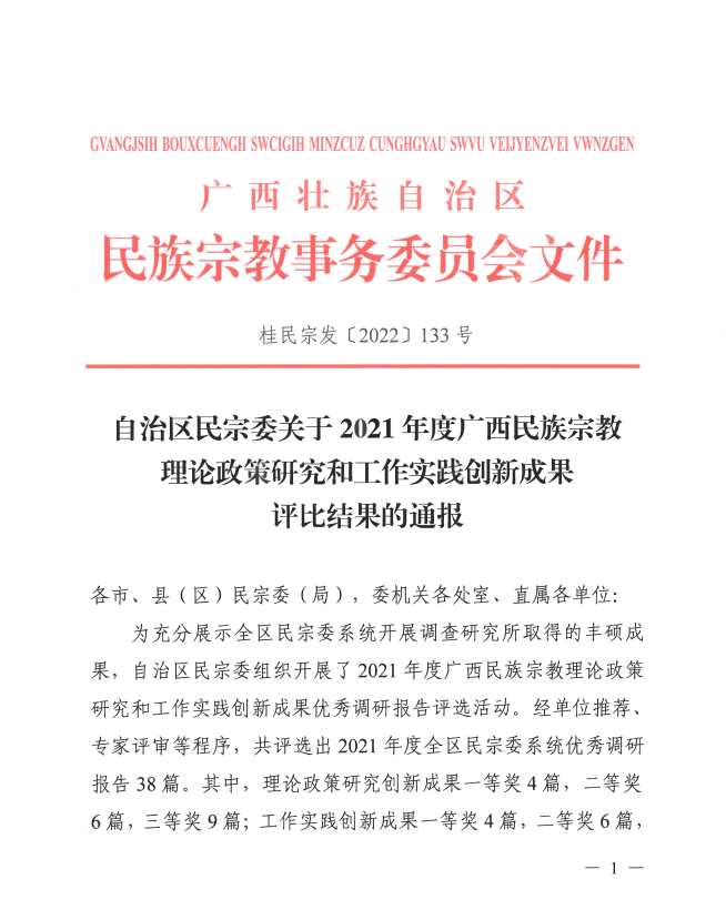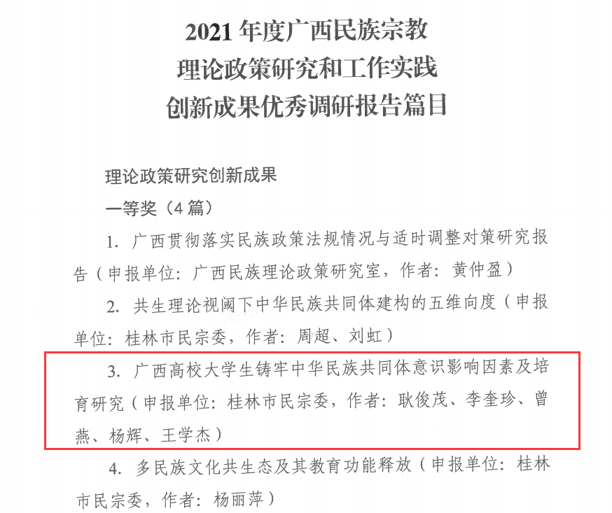 近日,自治区民宗委揭晓了2021年度广西民族宗教理论政策研究和工作实践创新成果评比结果,我校马克思主义学院党委书记耿俊茂教授撰写的调研报告《广西高校大学生铸牢中华民族共同体意识影响因素及培育研究》荣获2021年度广西民族宗教理论政策研究创新成果一等奖。