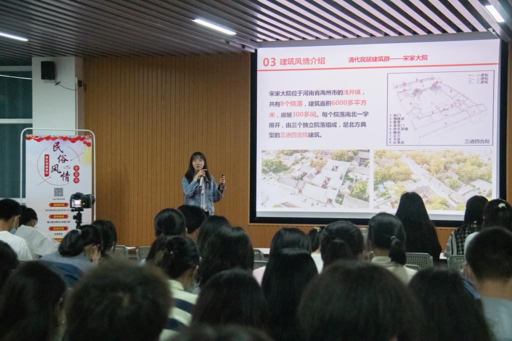 本次分享会以“探寻缤纷民俗风情,乐享多彩民族文化”为主题,将传统习俗与现代文明相结合,寓教于乐,寓理于情。活动中,同学们从风俗特色、节日民俗、婚恋民俗、饮食风俗、建筑风情、服饰风情等方面来介绍华北、华南、东北、西北等地区异彩纷呈的民俗风情,倾情展现我国56个民族各具特色的风土人情和风俗习惯,给大家带来了一场传统文化的精神盛宴。