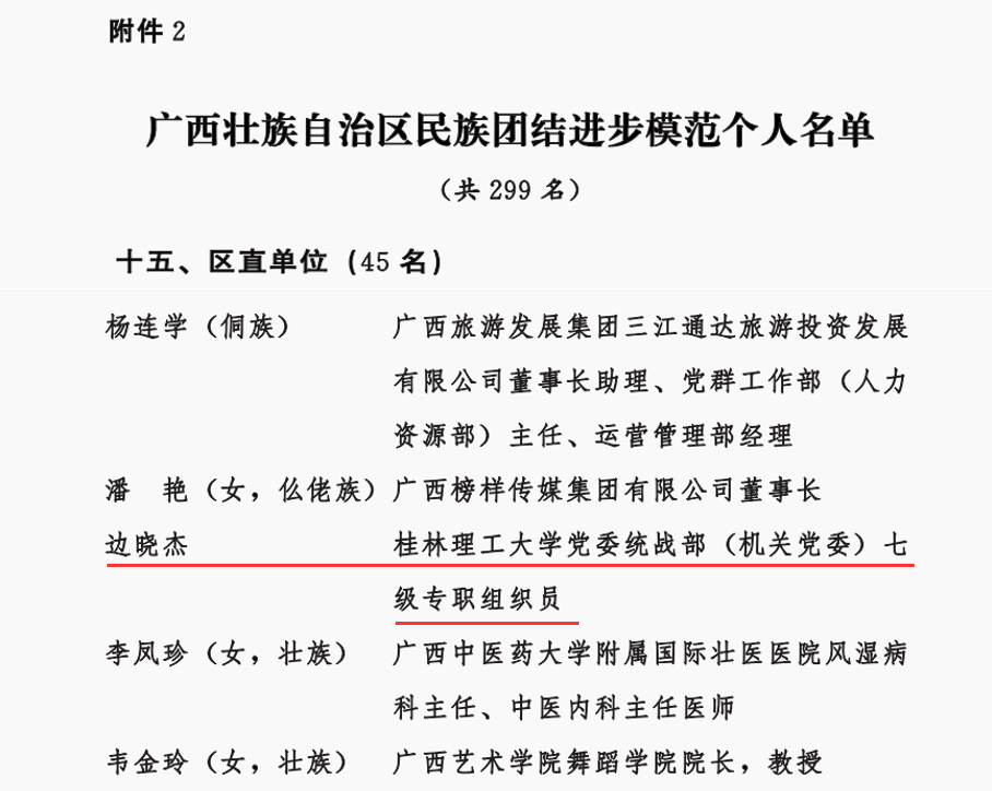 近日,自治区党委、自治区人民政府公布《关于表彰广西壮族自治区民族团结进步模范集体和模范个人的决定》,授予299名个人“广西壮族自治区民族团结进步模范个人”称号,我校机关党委七级专职组织员边晓杰名列其中。